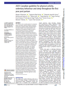 This consensus aims to provide guidance for postpartum women and people, healthcare providers and exercise professionals on physical activity, sedentary behaviour and sleep throughout the first year postpartum. The development of this guideline followed the Grading of Recommendations Assessment, Development and Evaluation (GRADE) methodology and the Appraisal of Guidelines for Research and Evaluation II instrument.
