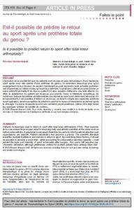 L’évolution de la société fait que les patients sont de plus en plus demandeurs d’une reprise du sport après avoir été opérés d’une prothèse de genou. Ils attendent beaucoup plus qu’un soulagement de leur douleur, ils veulent maintenant pouvoir reprendre leurs activités quotidiennes et sportives au même niveau qu’avant leur arthrose. Il serait donc utile de pouvoir donner un score prédictif permettant de dire au patient s’il sera capable d’atteindre une telle attente. En effet, la satisfaction du patient est devenue une priorité. Dans la littérature scientifique, de nombreux facteurs favorables et défavorables à la reprise du sport sont clairement retrouvés. En les assemblant, il est possible d’obtenir un score qui, en tenant compte des capacités sportives avant opération, serait susceptible de prédire le sport et le niveau d’intensité de ce dernier après la chirurgie. Ce score nécessite encore une validation psychométrique, même s’il a déjà rempli les quelques critères de validité de contenu.